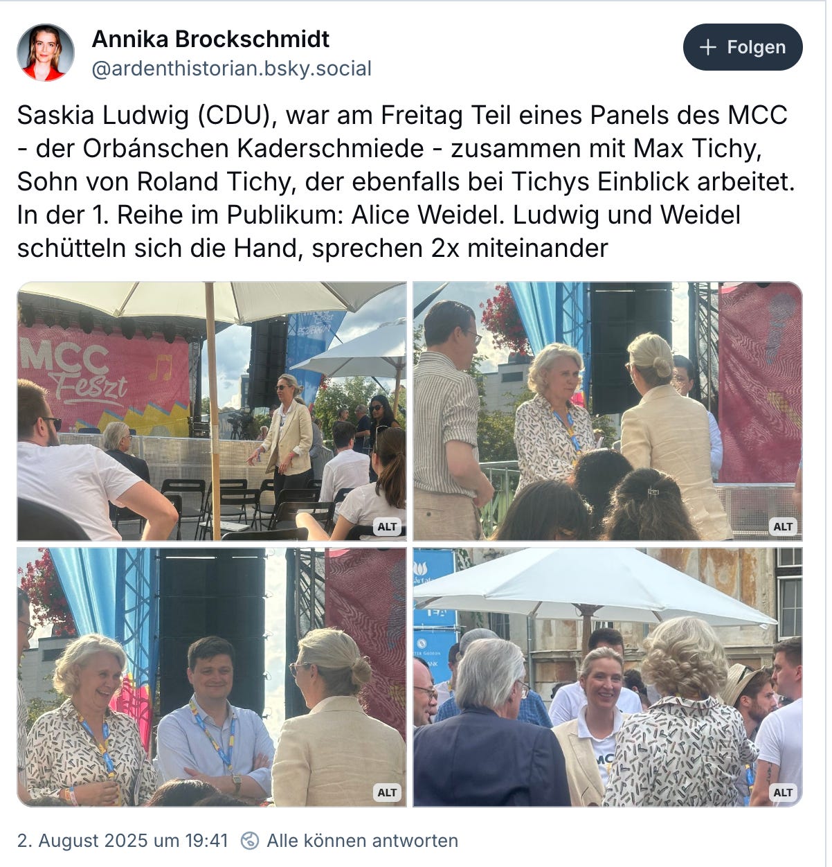 Das MCC gilt als Teil des politischen Netzwerks von Orbán und transportiert Ideologien von rechtskonservativen US-Publizist*innen. Die Teilnahme Ludwigs an dem Panel wurde öffentlich durch die Journalistin Annika Brockschmidt gemacht, die Fotos von Ludwig im Gespräch mit Alice Weidel auf der Social-Media-Plattform Bluesky veröffentlichte.
