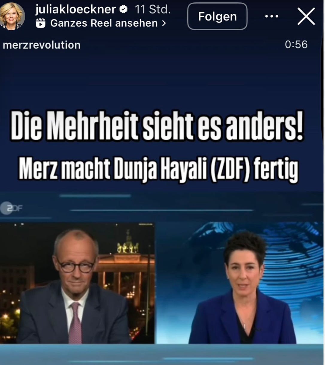 Vor einigen Wochen teilte Klöckner auf ihrem Instagram-Kanal ein Video vom Account #merzrevolution – einem Format, das sich rechtskonservativ inszeniert, populistische Narrative verbreitet und migrationskritische Inhalte gezielt emotionalisiert. Der Clip zeigte Friedrich Merz im Interview mit ZDF-Moderatorin Dunja Hayali. Inhaltlich ging es um den Familiennachzug Geflüchteter – ein kontroverses Thema.